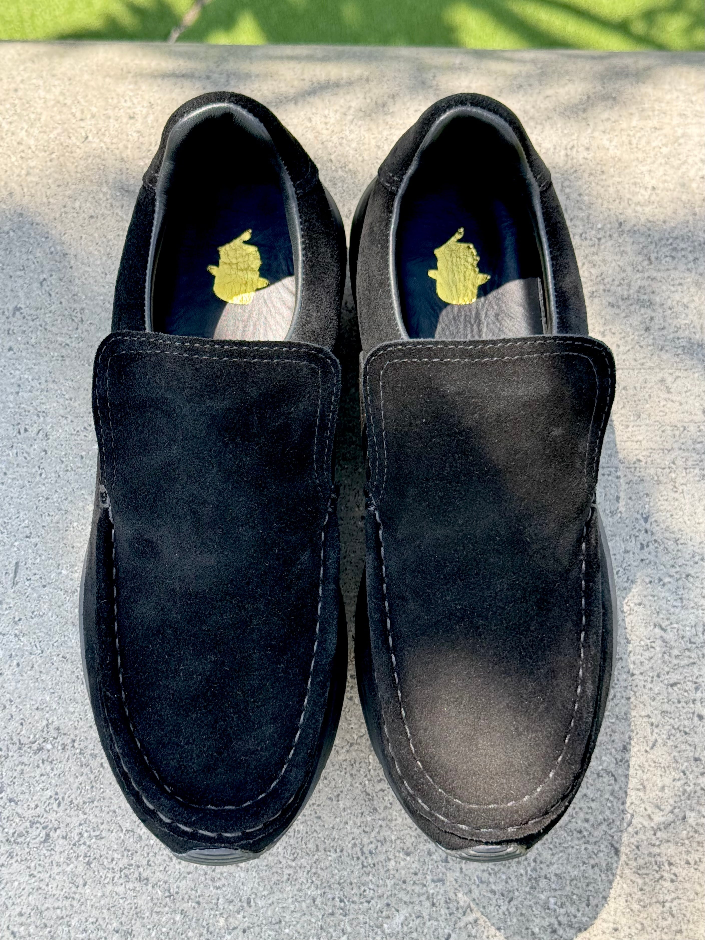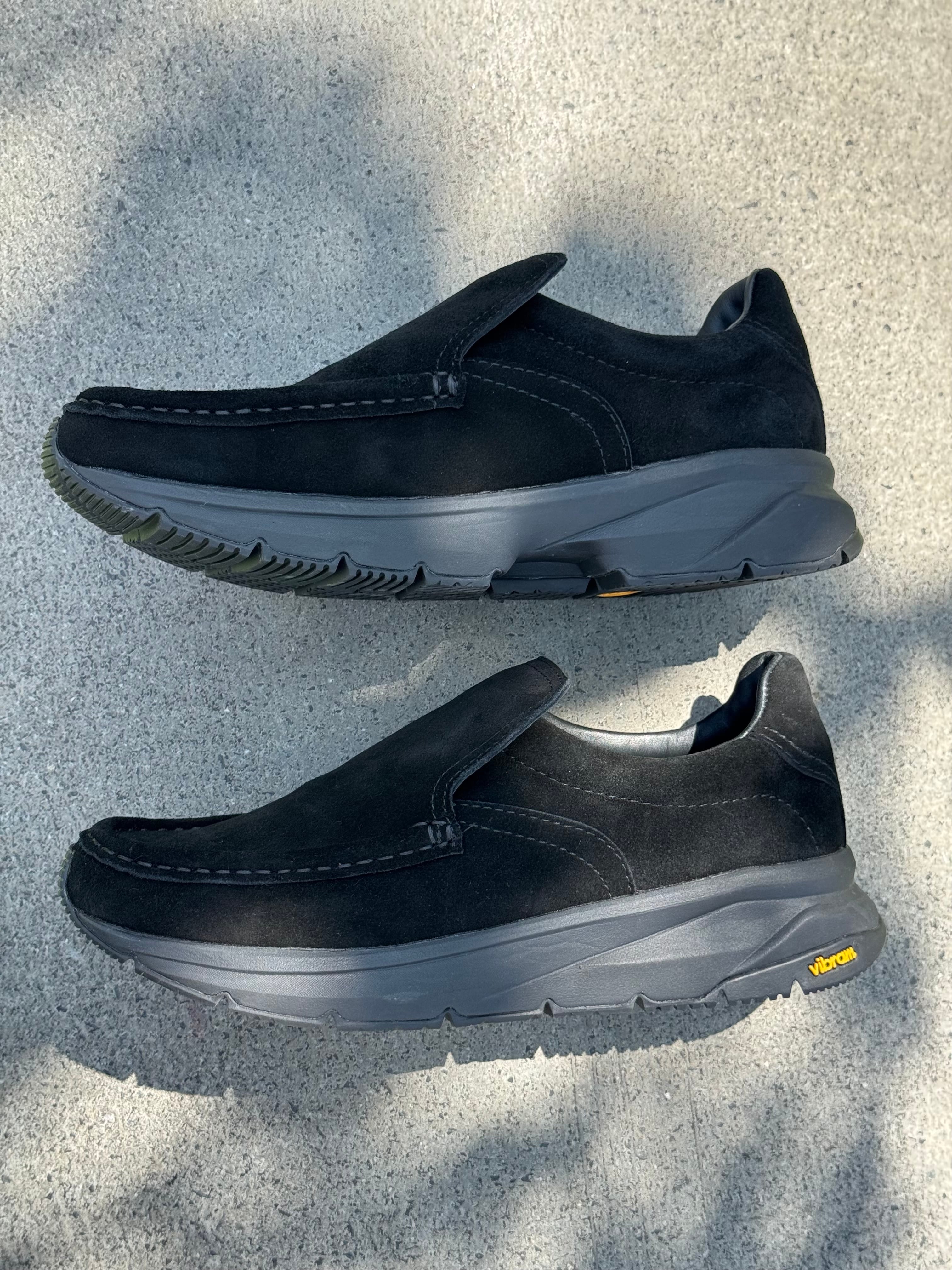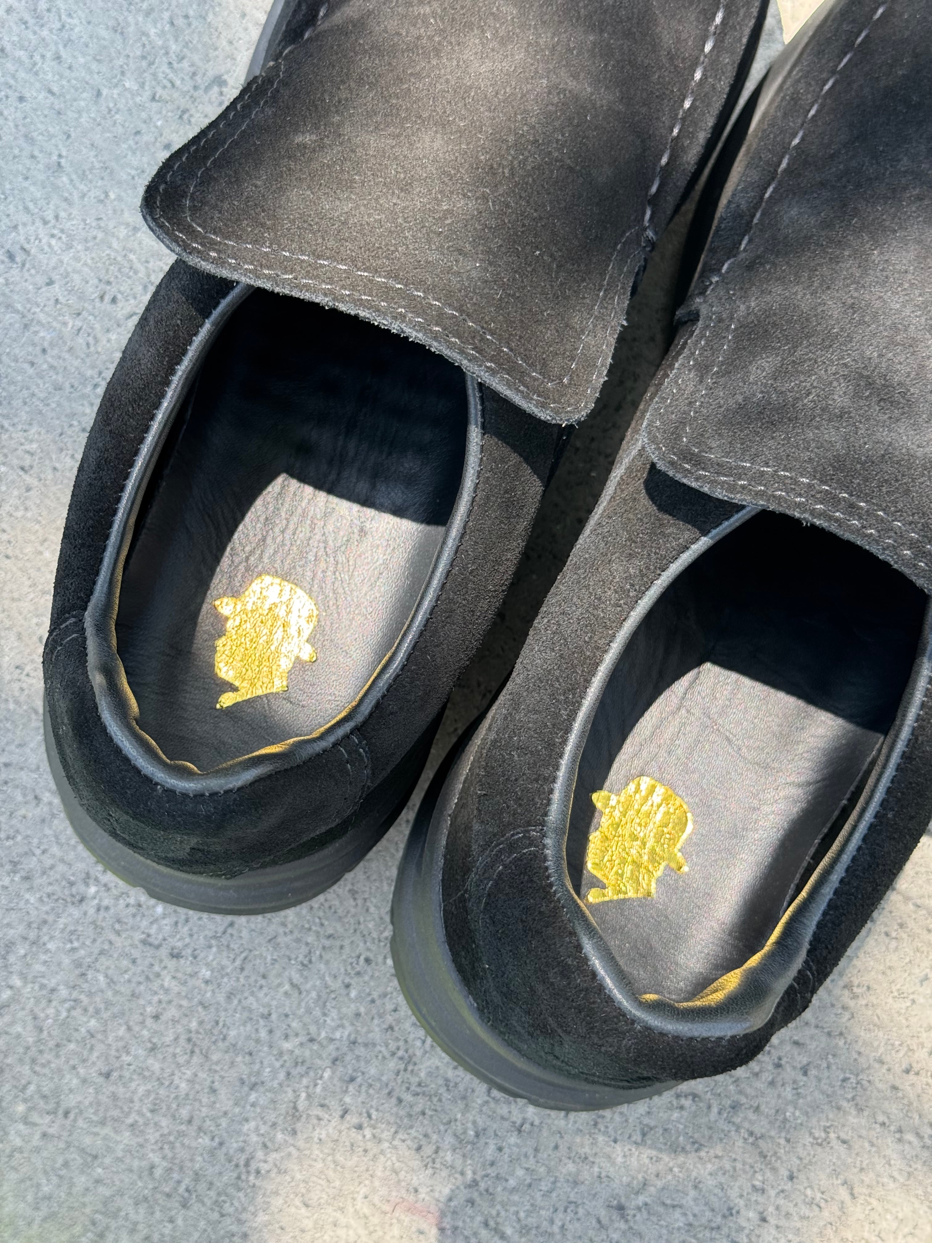 スエードレザーのアッパーに厚底のソールを組み合わせたスリッポンタイプのシューズ。