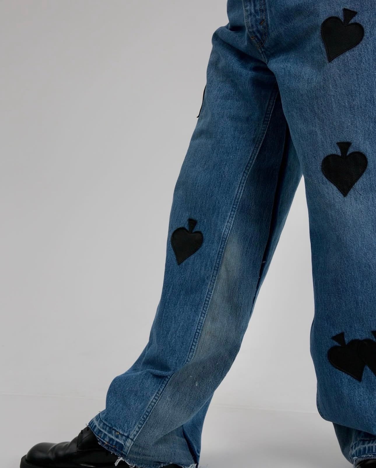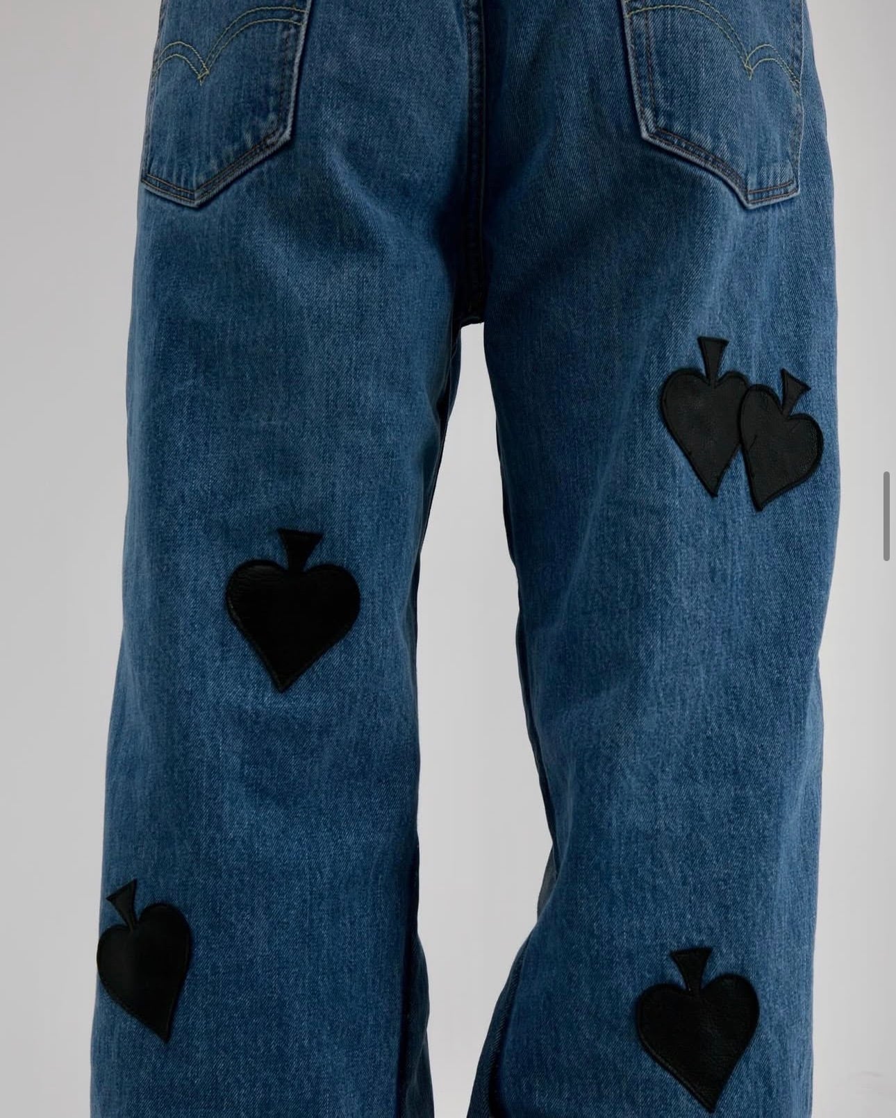 TanCのアイコンであるスペードをゴートレザーでパッチワークしたアイコニックなデニムです。