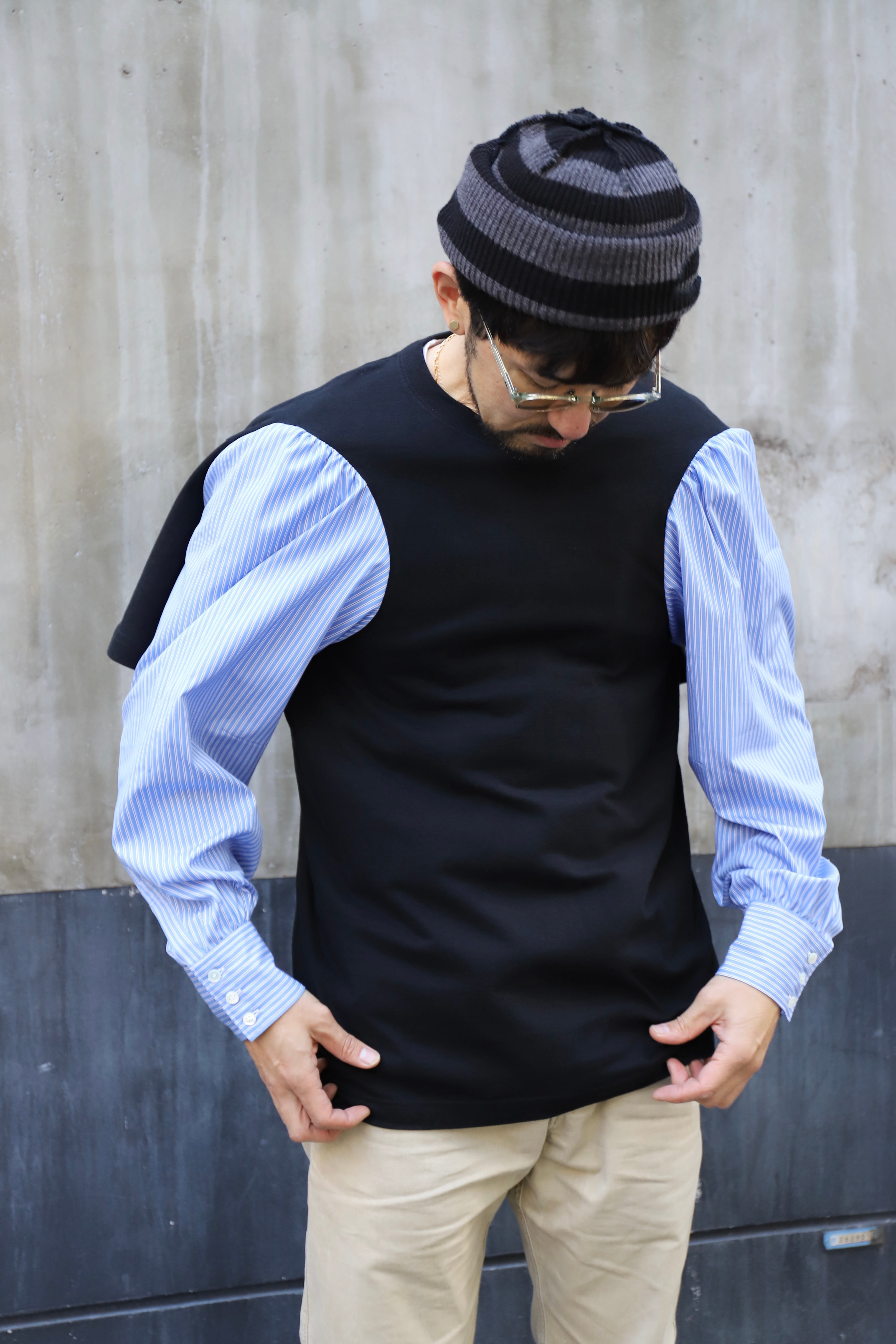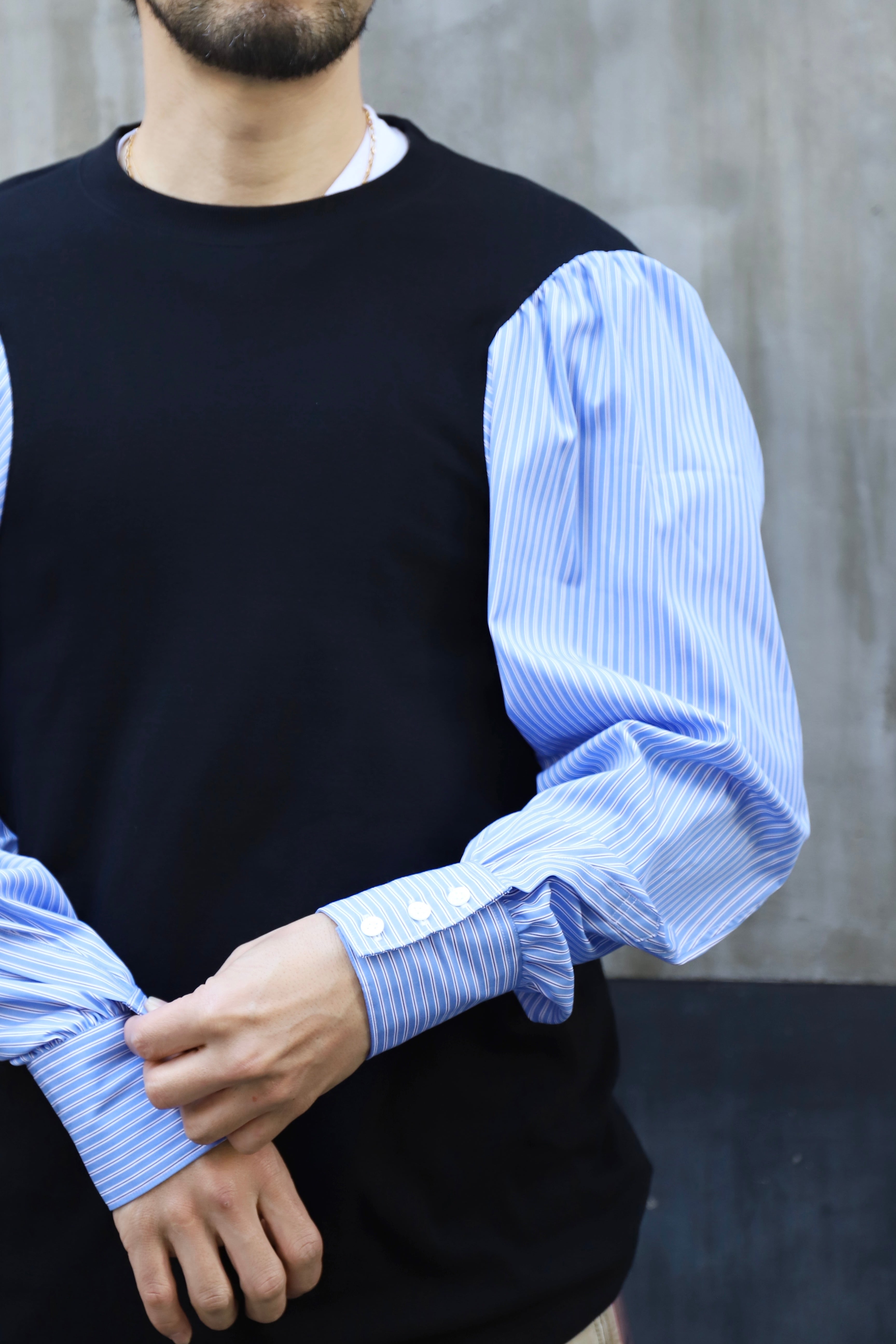 こちらのカットソーはボディ部分にシャツの袖をドッキングさせたデザインが魅力です。独特なスタイルで、他にはないオリジナルの雰囲気を楽しむことができます。