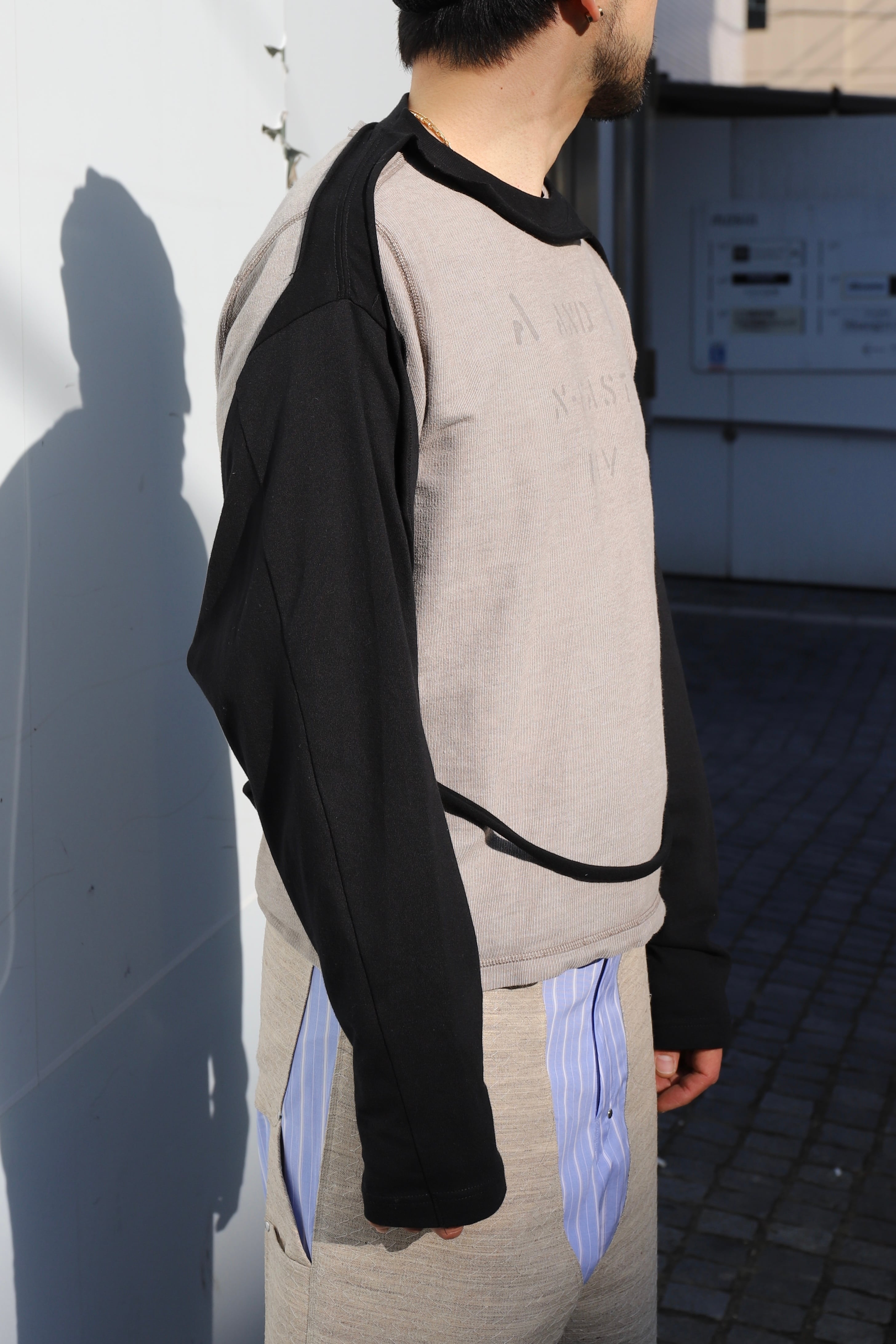 こちらのカットソーはボディ部分の生地を切り抜いた独特なスタイルです。
